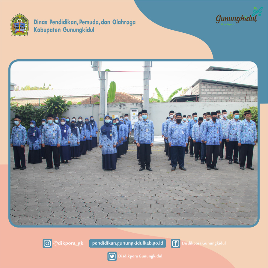 WONOSARI- Dinas Pendidikan, Pemuda, dan Olahraga (Disdikpora) Kabupaten Gunungkidul melaksanakan apel pagi dan ikrar halal bihalal. Bertempat di halaman kantor Disdikpora Kabupaten Gunungkidul dengan diikuti oleh seluruh karyawan Dinas Pendidikan, Pemuda, dan Olahraga Kabupaten Gunungkidul Penilik PAUD, Pengawas TK, Pengawas SD, dan Pengawas SMP dengan menerapkan protokol kesehatan pencegahan virus COVID-19 dengan ketat.
